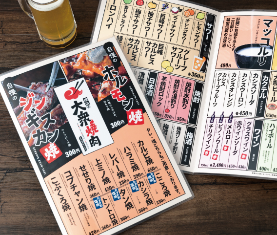 愛され続けてきたお店を、さらに印象に残したいいつもお客さまでいっぱいの「誰でも気軽に焼肉を楽しめる店」。「明日への活力に」というオーナーの願いが伝わるような、力強いビジュアルを模索しました。この先もずっと愛され続けるよう縁起のいいモチーフをシンボルとしこれまでのコンセプトはそのままに、よりお客様の心に残るカタチを様々なツールで追求しました。